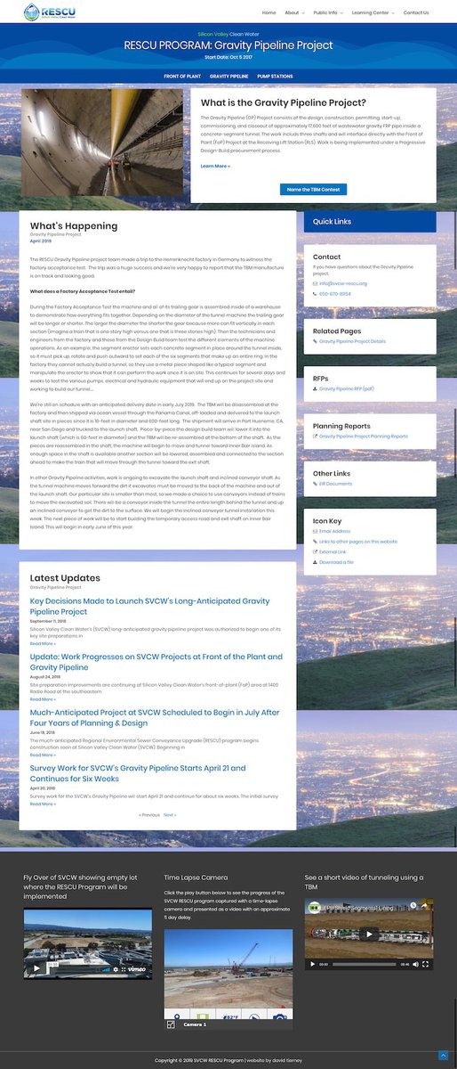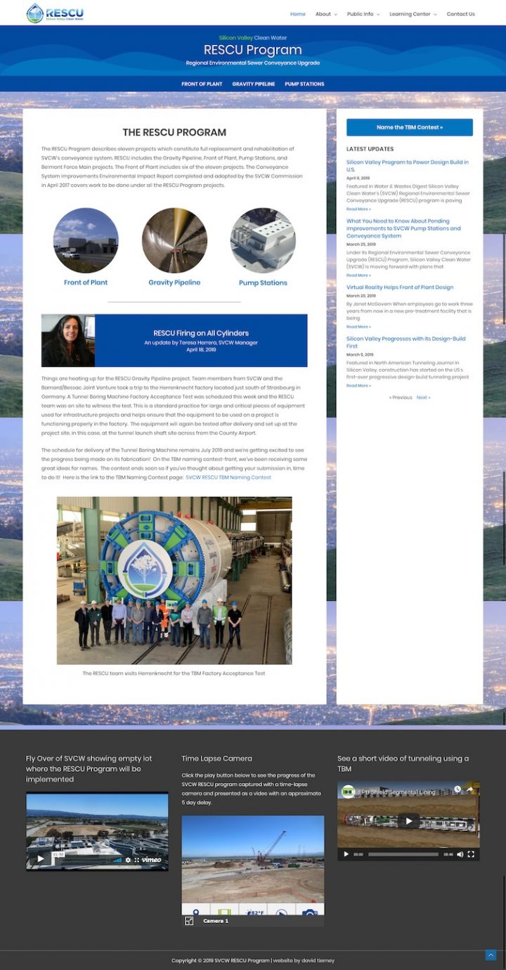 Silicon Valley Clean Water (SVCW) manages a wastewater conveyance system and water resource recovery facility in Silicon Valley, CA. In April of 2107 SVCW approved a 400+ million capital improvement project to fully replace and rehabilitate their sewer conveyance system. In June of 2018 David Tierney was hired to create a website to help manage public communication about the project.